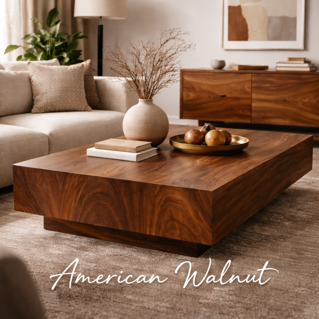 Renowned for its deep chocolate tones and flowing grain, American Walnut is a favourite for luxury interiors. It offers excellent stability and finishes beautifully, making it ideal for dining tables, statement coffee tables, wall art, and sculptural accents.