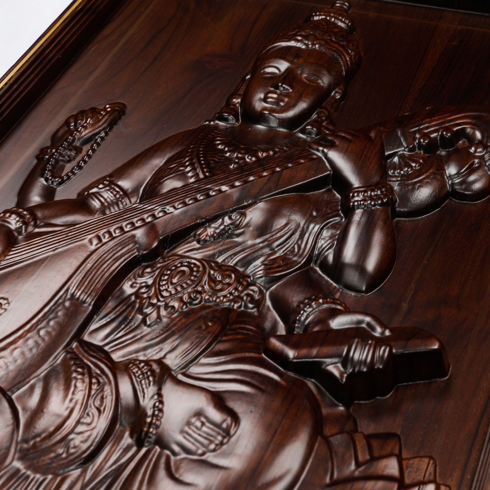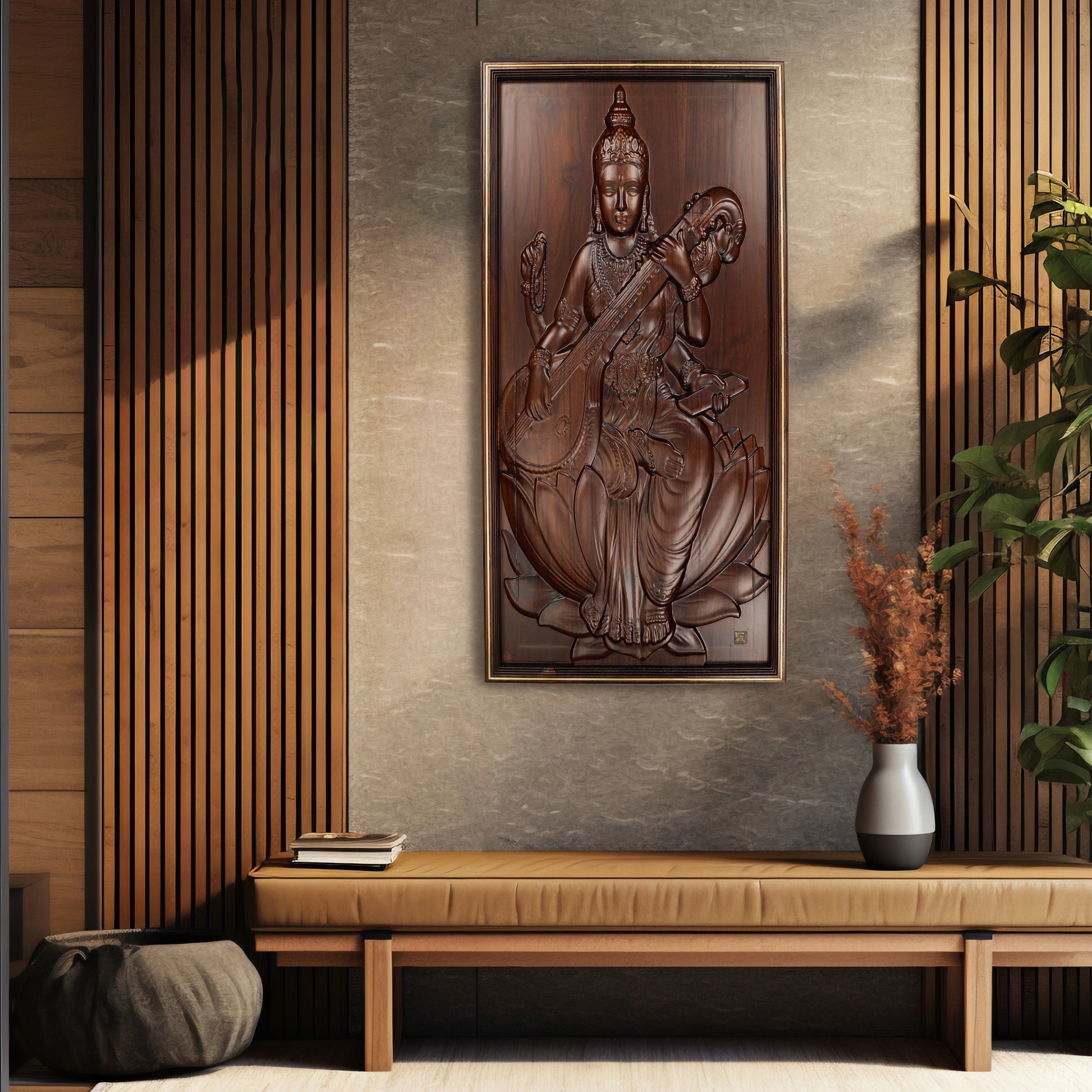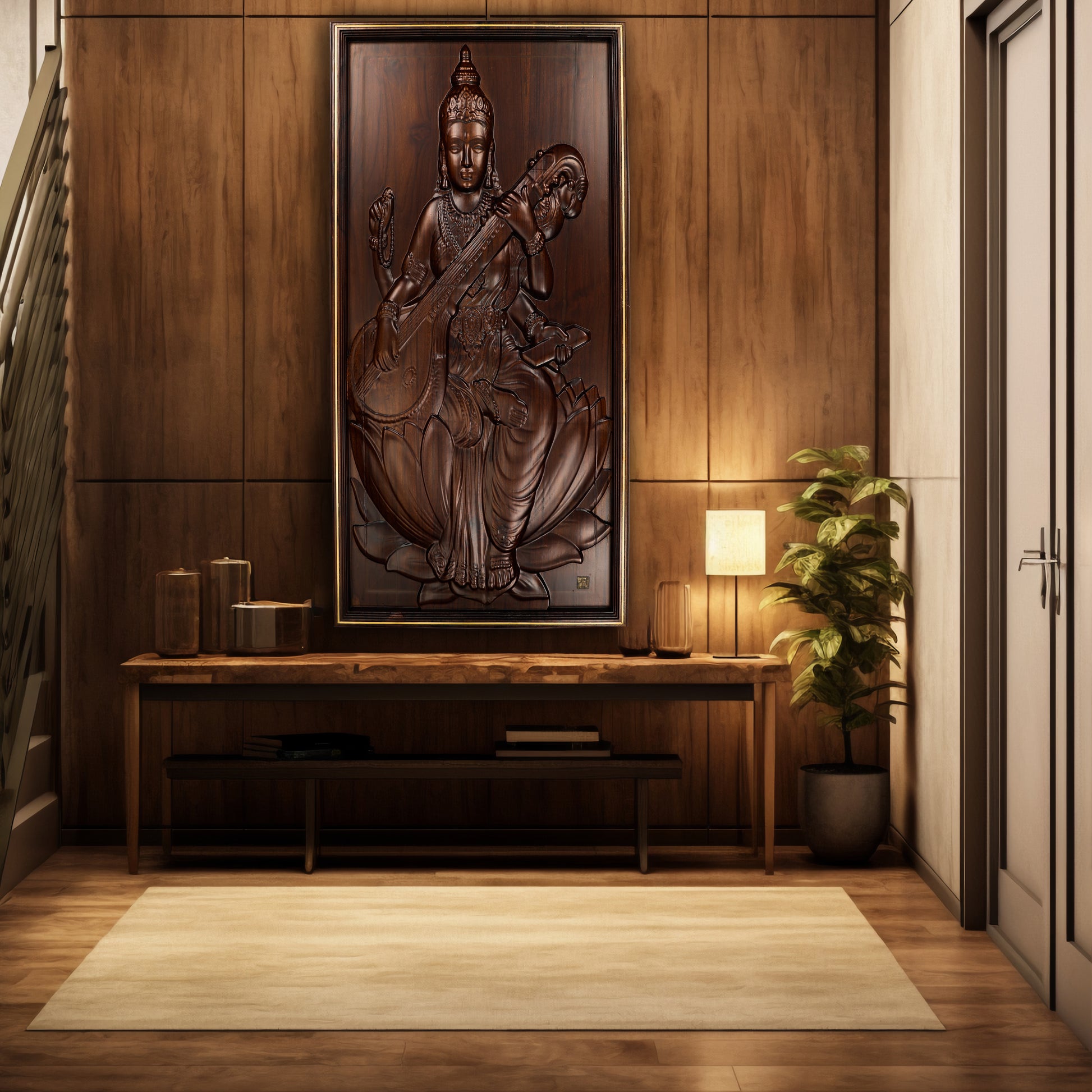 This exquisite 3D carved Goddess Saraswati wall décor piece is handcrafted from premium imported teak wood and beautifully captures the goddess of knowledge and wisdom in her Chaturbhuja form. Seated on a lotus, she holds a veena, a pustak, and a mala, symbolising harmony, knowledge, and spirituality. Intricate jewellery and a regal crown enhance her elegance, making this divine piece a perfect addition to any home or sacred space.