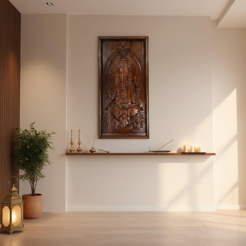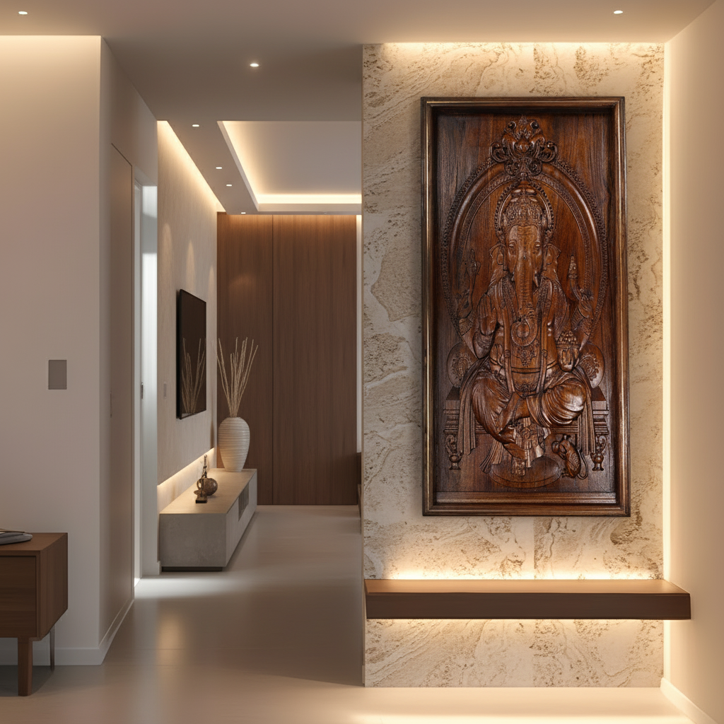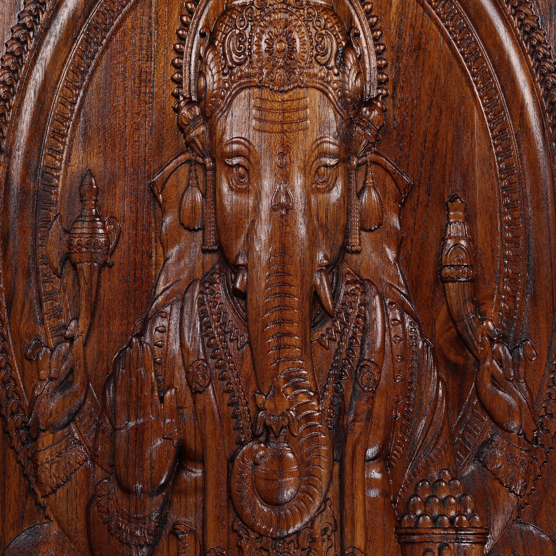This exquisite wall panel depicts Lord Ganesha, the remover of obstacles and the harbinger of prosperity, carved entirely from premium solid wood by master artisans. Each curve and contour is meticulously detailed to capture divine grace - from the ornate crown to the symbolic posture, every element reflects devotion and craftsmanship.