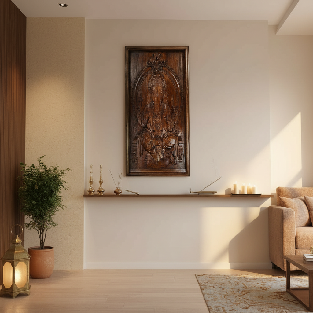 The natural wood grains and hand-polished finish enhance its timeless beauty, making it a perfect statement piece for living rooms, temples, foyers, or offices. Each piece is unique, with subtle variations in texture and tone - a true celebration of handcrafted authenticity.