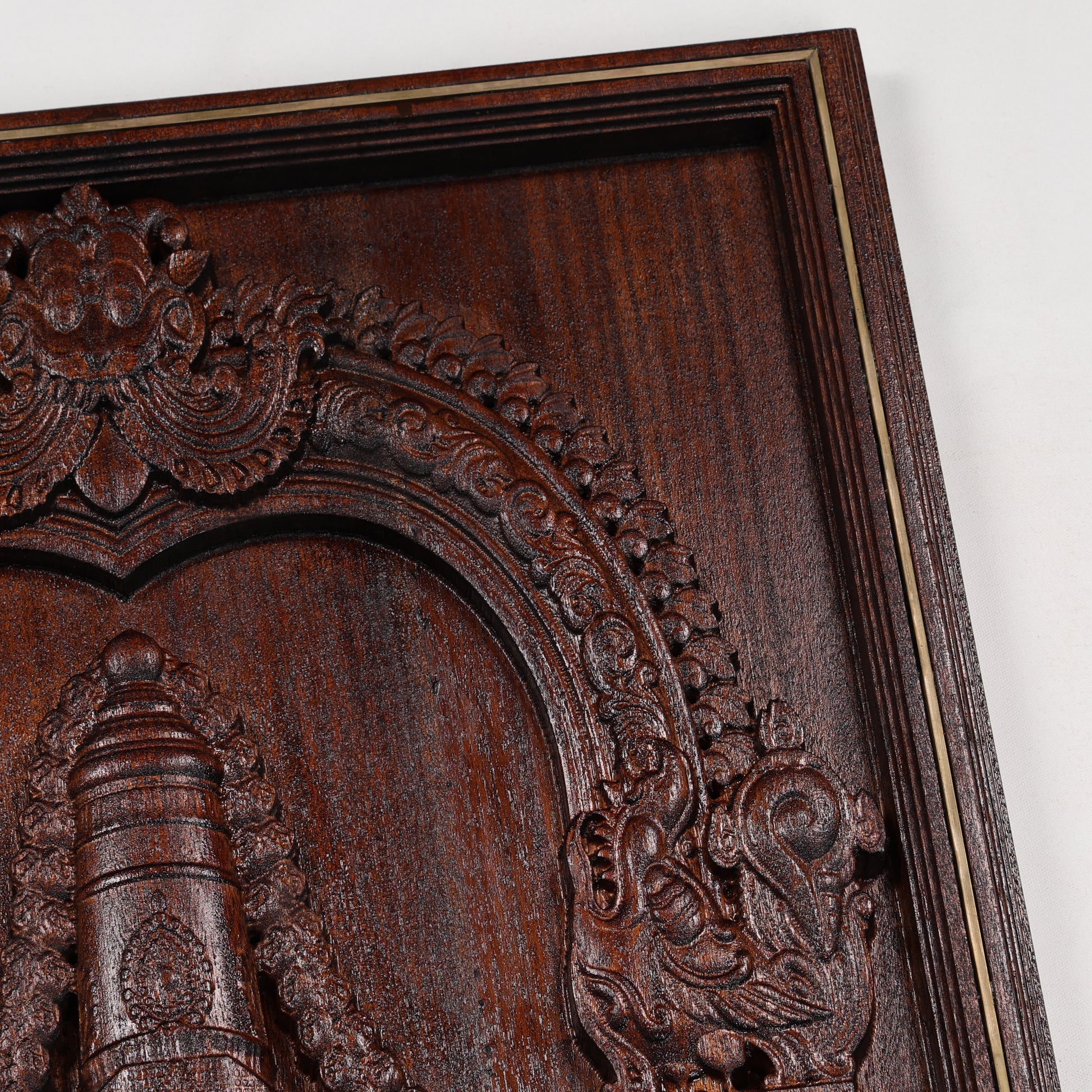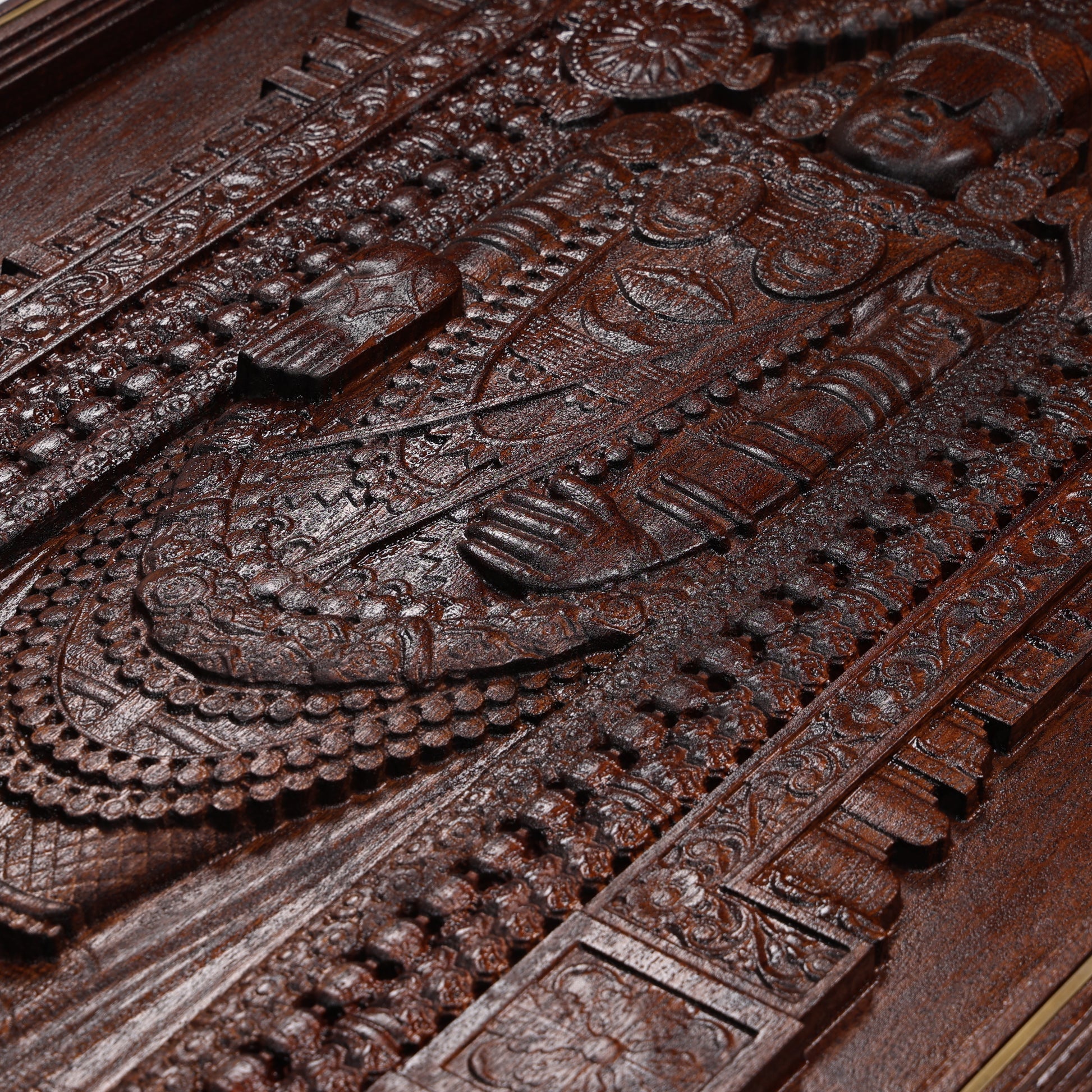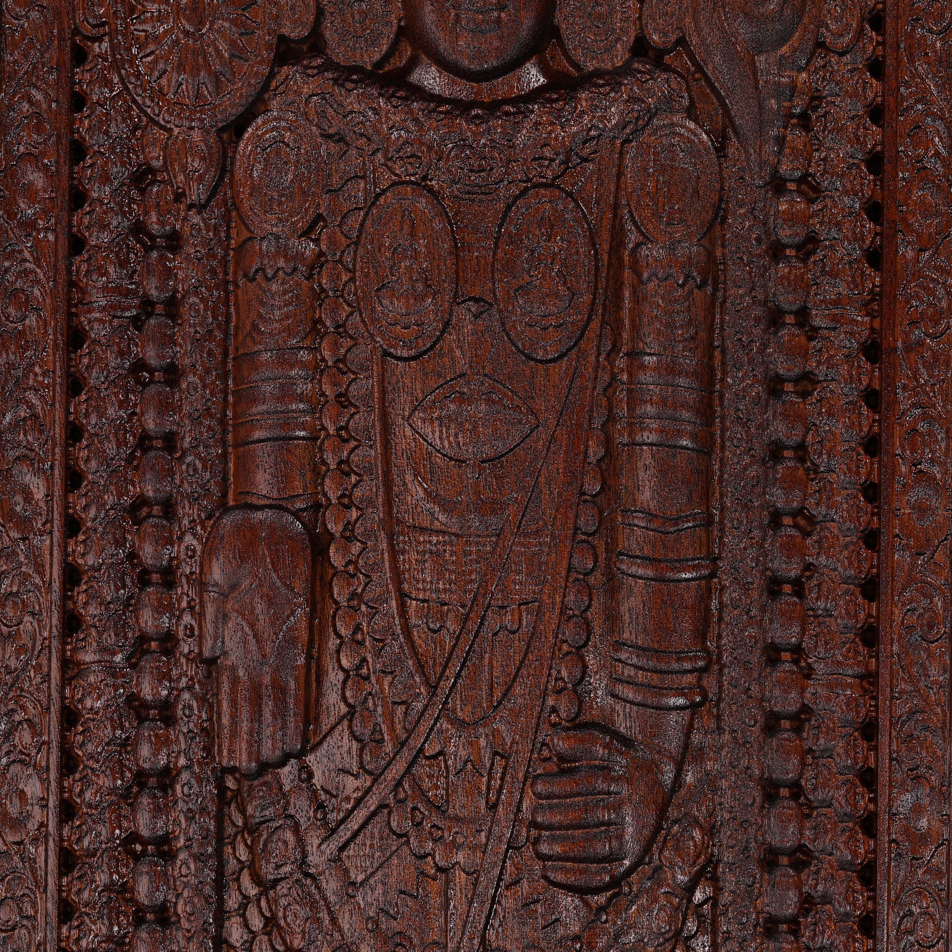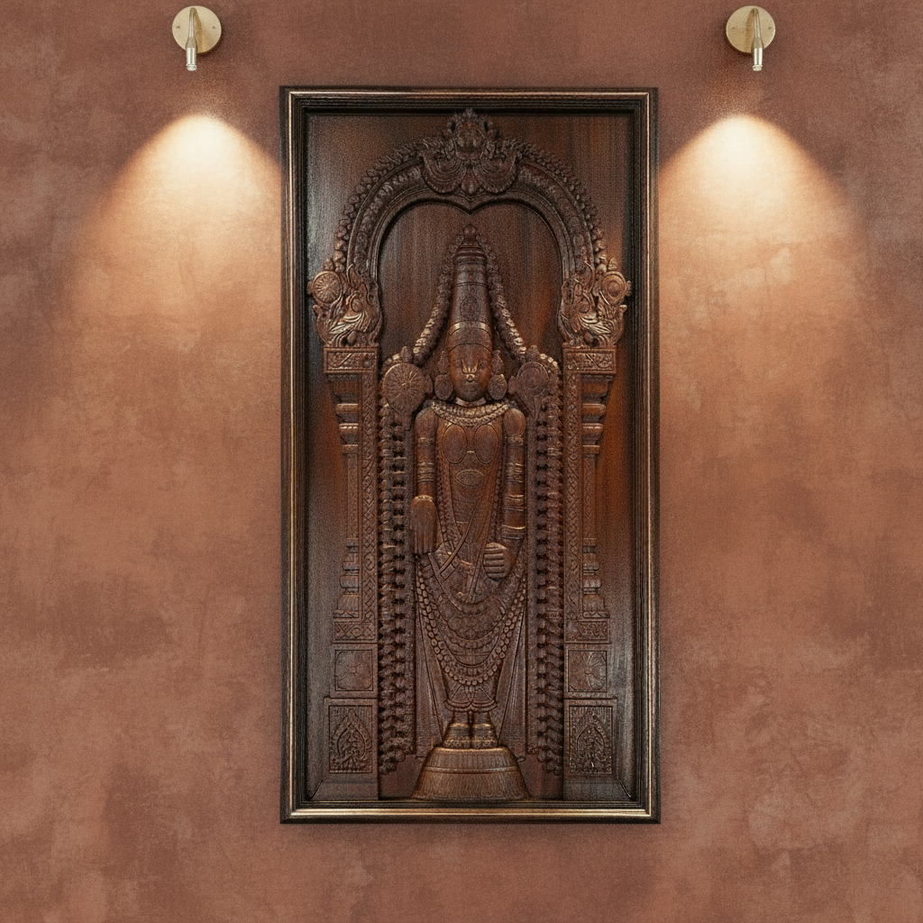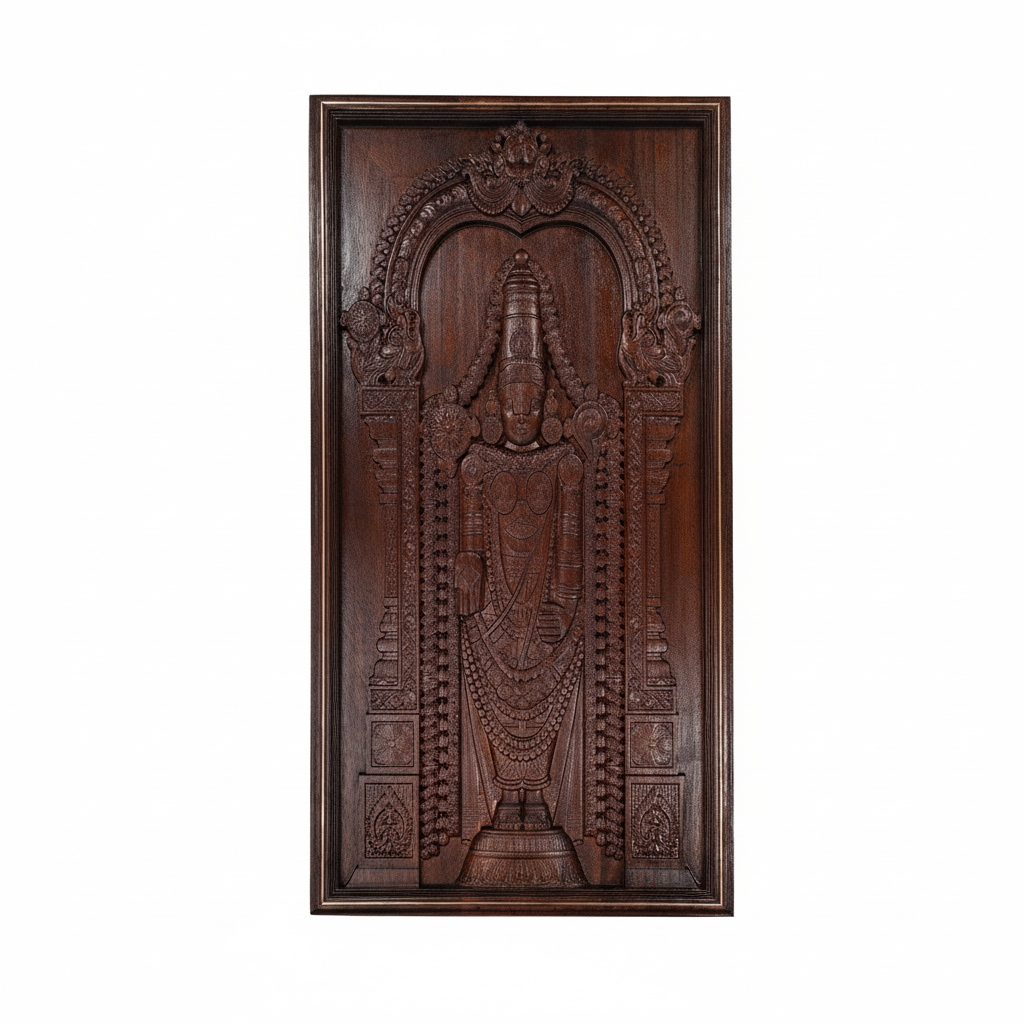 Handcrafted from premium mahogany wood, this masterpiece captures Lord Balaji’s majestic presence — holding the Sudarshana Chakra and Conch, symbols of protection and righteousness.