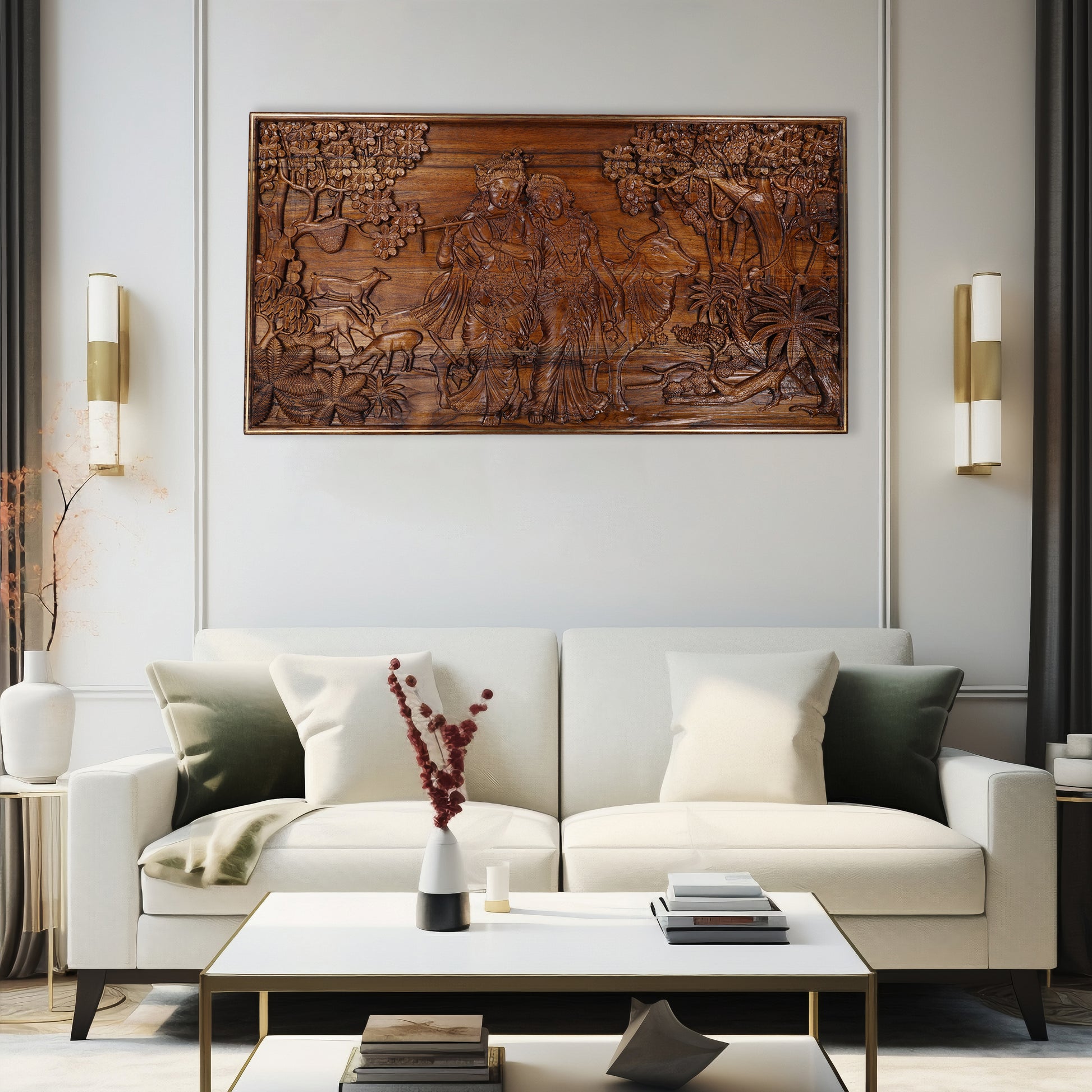 Experience the enchanting beauty of Radha and Krishna with this captivating 3D-carved landscape wall décor piece. Crafted from imported teak wood, it depicts Krishna playing the flute amid the lush jungles of Vrindavan, surrounded by a peaceful cow.