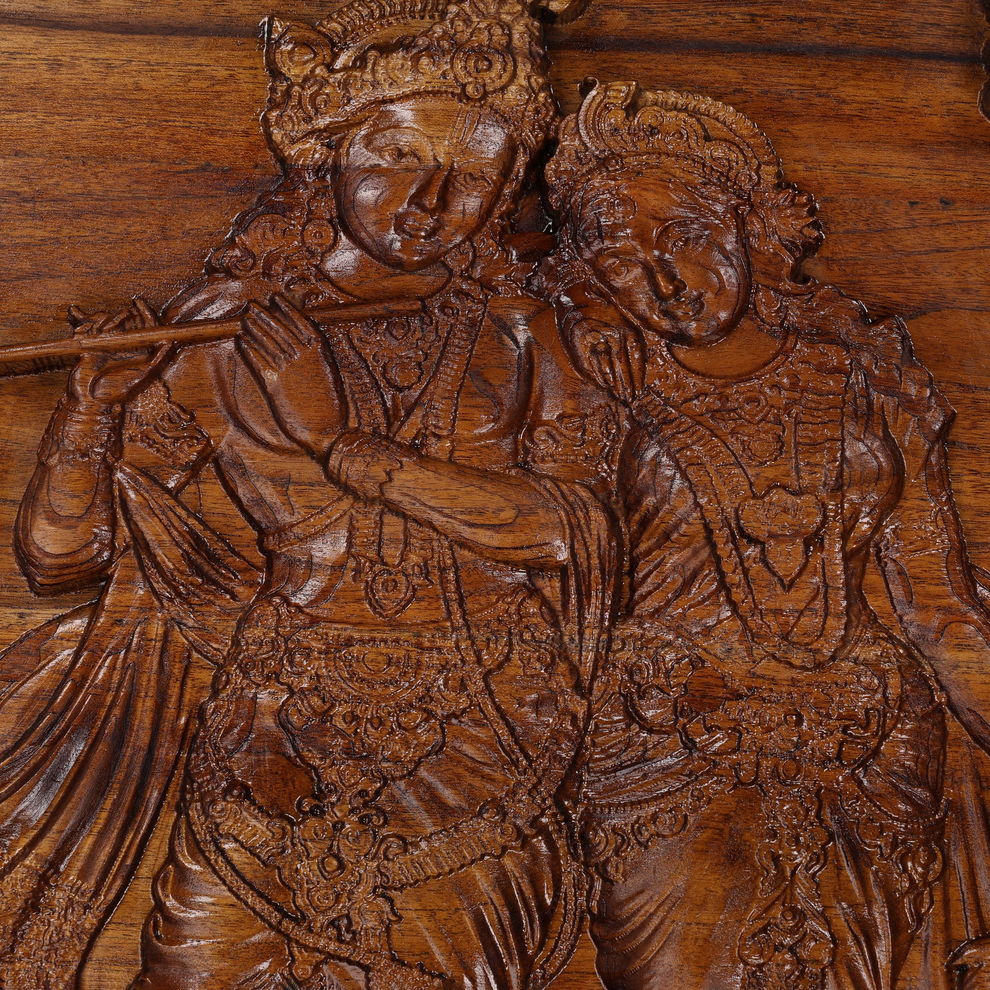 Radha Krishna Wall Décor Elevate your spiritual space with this exquisite handcrafted wall piece, meticulously carved from premium wood. This devotional artwork captures the divine essence of Radha and Krishna, serving as a meaningful focal point for meditation and prayer. The superior craftsmanship and natural wood grain create an authentic, timeless aesthetic that complements both traditional and contemporary interiors. Perfect for temples, prayer rooms, or homes seeking to deepen their spiritual connection. A treasured addition to any devotional collection.