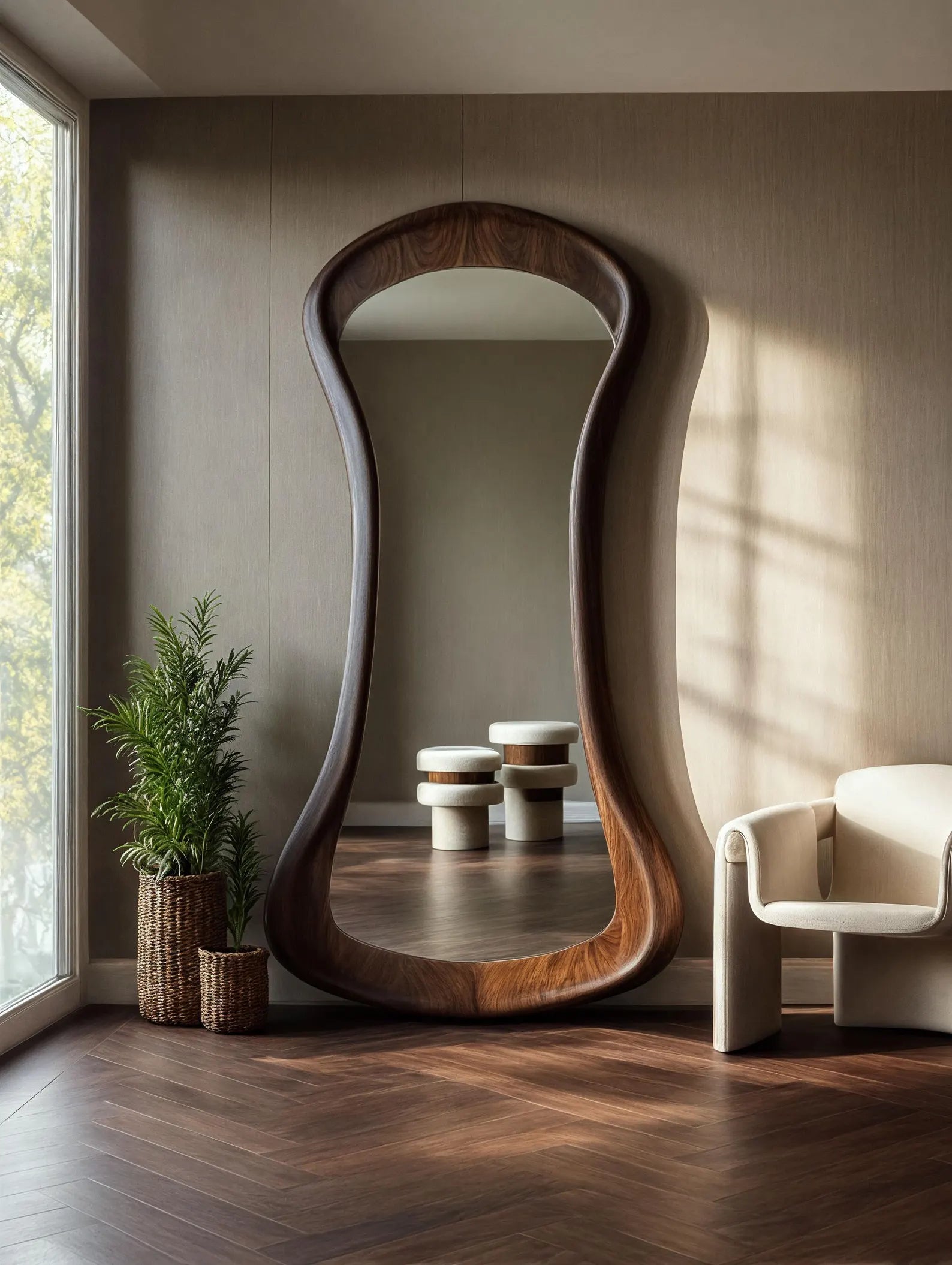 Designed to create an impression of organic harmony, this mirror is a perfect balance between modern minimalism and handcrafted art. Whether leaning gracefully in a corner or mounted on a wall, it brings an understated luxury to any interior.