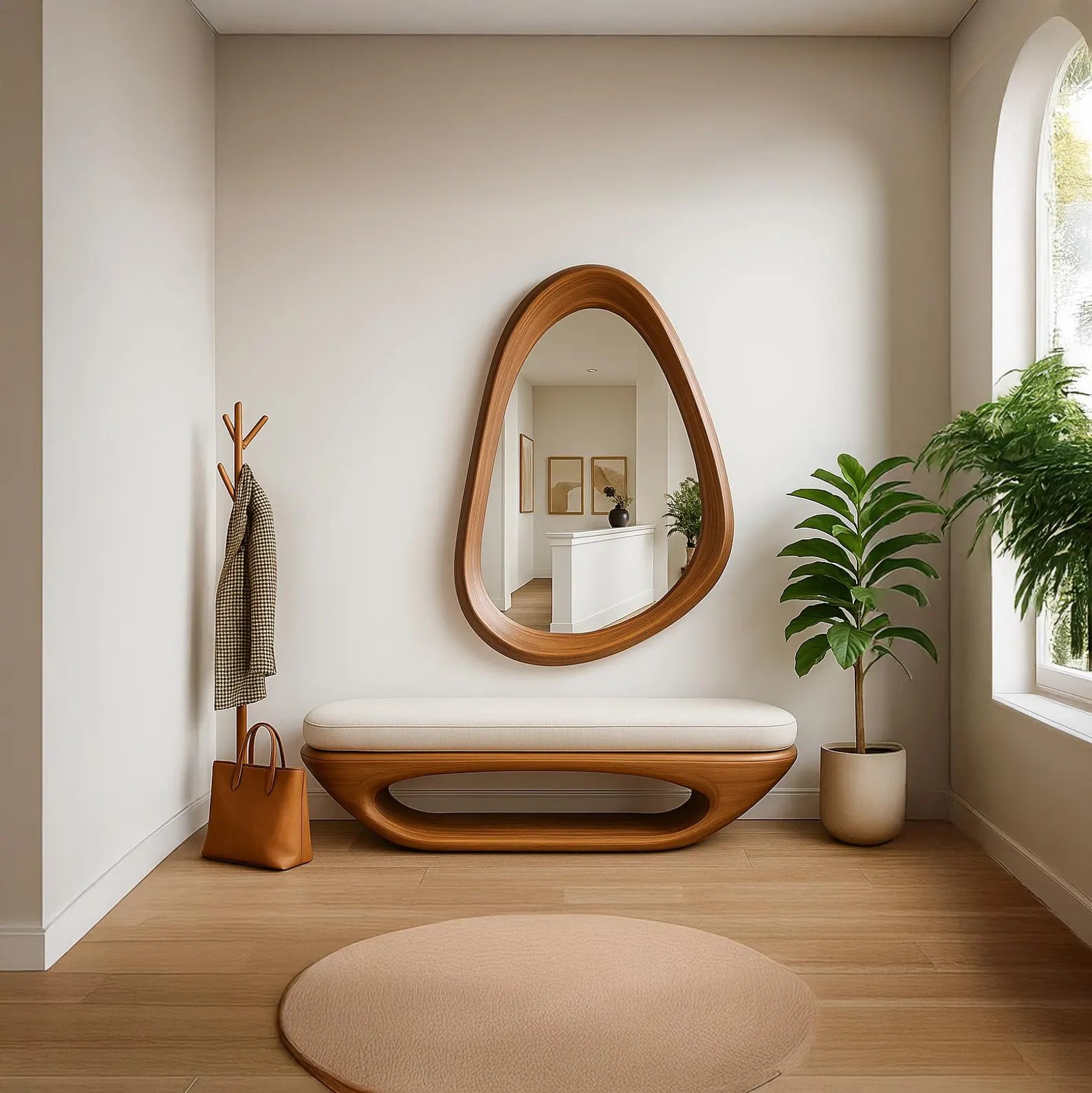 Its asymmetrical form creates a stunning focal point — playful yet refined — reflecting the beauty of handmade craftsmanship and the calm of natural design. Whether mounted in a living room, entryway, or bedroom, the Pebble Mirror brings warmth, softness, and a sculptural charm to every space.