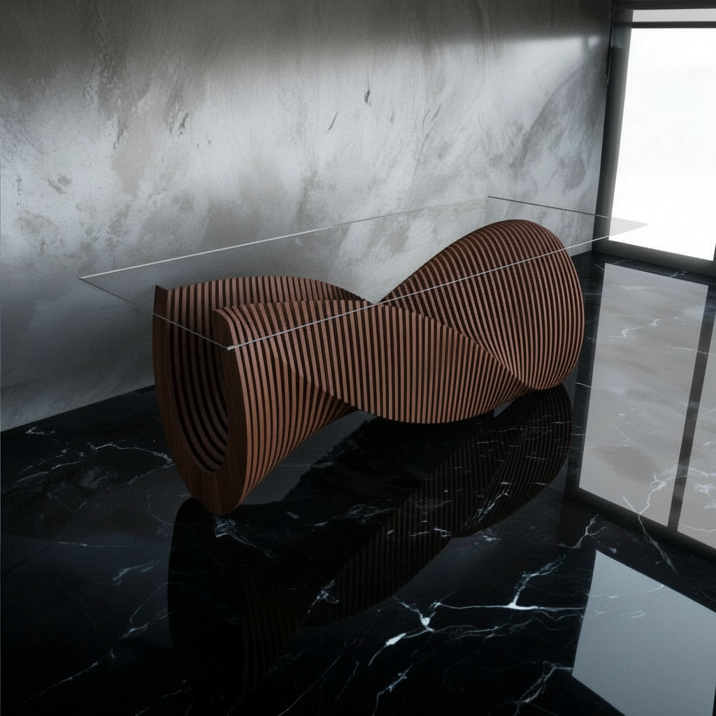 The Twist In Time Table represents a sophisticated fusion of artisanal craftsmanship and contemporary design. Each piece is meticulously handcrafted from premium Birch Ply, featuring a distinctive twisted silhouette that serves as both functional furniture and sculptural statement.